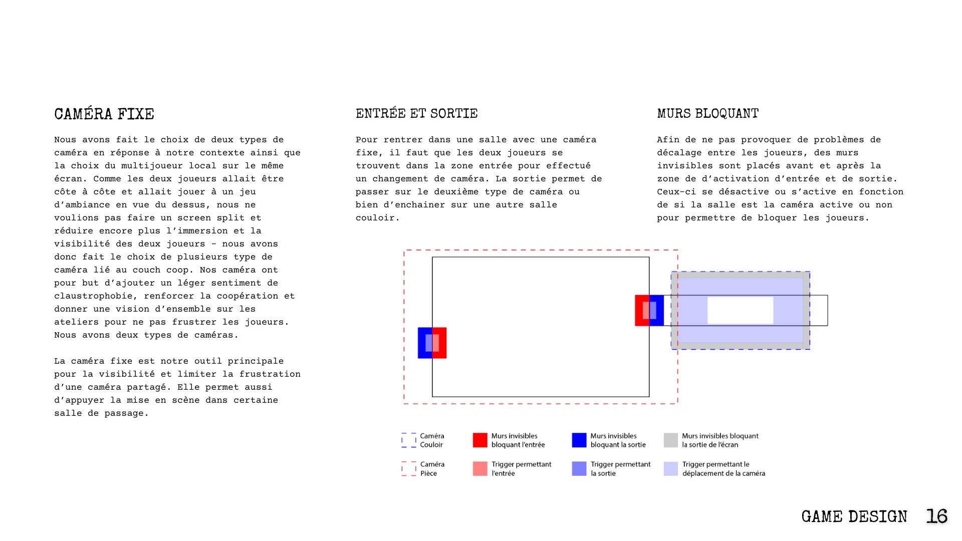 After deciding on local co-op due to time constraints, we knew both players would share the same screen. This limitation led me to design a set of camera rules, based on two behaviors: a fixed camera and a side-scrolling corridor camera. Both camera types required invisible wall systems to encourage players to wait for each other and progress together without leaving the camera’s view. For the side-scrolling camera, if players move in opposite directions, the camera locks in place, making it impossible to go off-screen - reinforcing cooperation and synchronized movement.