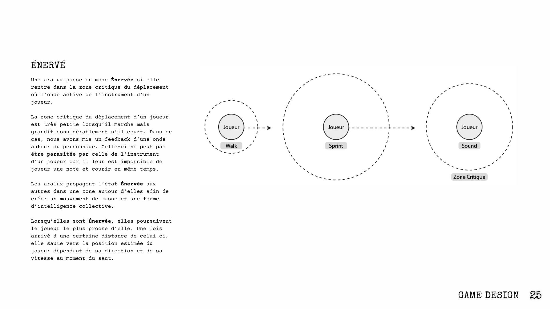 Then, I worked on the behavior of our enemies: the aralux. Since the core mechanic for players revolves around using instruments and producing sound, the Aralux are also attracted to sound. By doing so we created a mechanics loop that was interresting for the game. Their lightbulb-shaped bodies serve as both a visual indicator of their current state and a way to enhance the game's atmosphere. As the game progresses, rooms become darker, and the Aralux contribute to the lighting, reinforcing the tension and ambience.